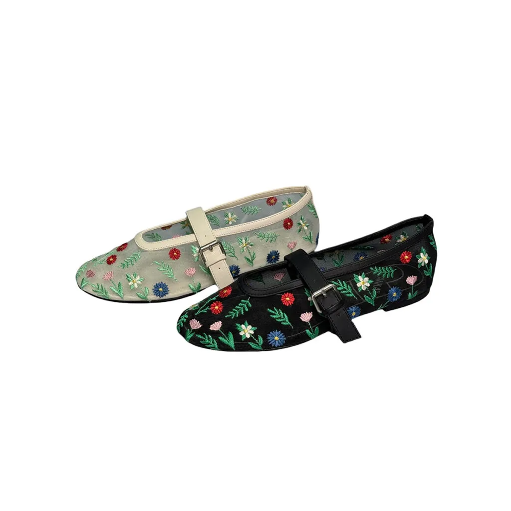 T-F010 Women's Floral Embroidery Ballet Mesh Flat Shoes